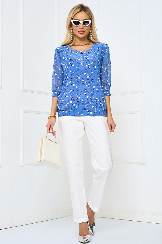 Нежность в каждом взгляде! Даниэлла – блузка свободного силуэта из блузочной ткани с цветочным принтом. Вырез горловины классический округлый, декорирован спереди пуговицей-застежкой. Рукава 3/4, втачные, оторочены манжетами. Блуза отлично сочетается с различными элементами гардероба.