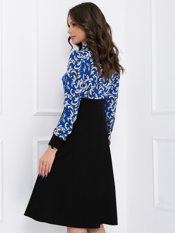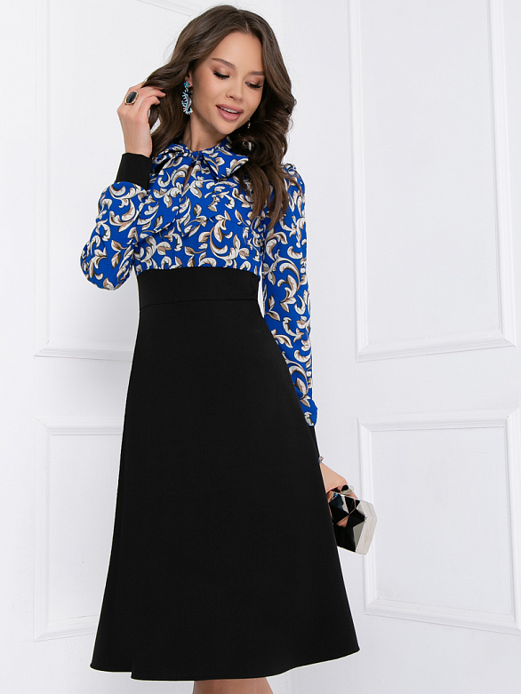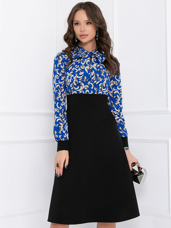 Яркое и контрастное платье Беатрис, которое никого не оставляет равнодушным! Приталенное платье с классическим низом: юбкой-«солнце» и контрастным верхом из легкой плательной ткани. V-образный вырез дополнен воротником – бантом. Завышенная талия сделает Вас визуально стройнее, а оригинальный галстук-«бант» придаст вашему образу нарядность. Рукава длинные, отороченные манжетами в цвет юбки. В таком платье Вы будете себя чувствовать комфортно практически в любой обстановке: в театре, ресторане, университете, или в офисных буднях.
