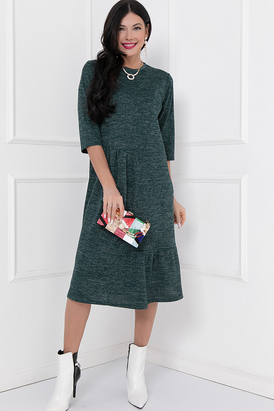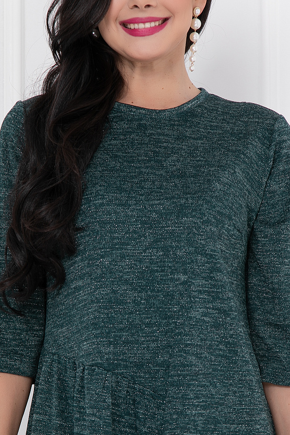 Кампано – платье ассиметричного кроя из меланжевого трикотажа с люрексной нитью в благородном зеленом оттенке. Такое изделие подчеркнет женственность, миловидность и нежность, поскольку ткань красиво ложится и в меру облегает силуэт. Вырез горловины классический округлый, обработан обтачкой. Рукава 3/4, втачные. По низу левой стороны – волан.