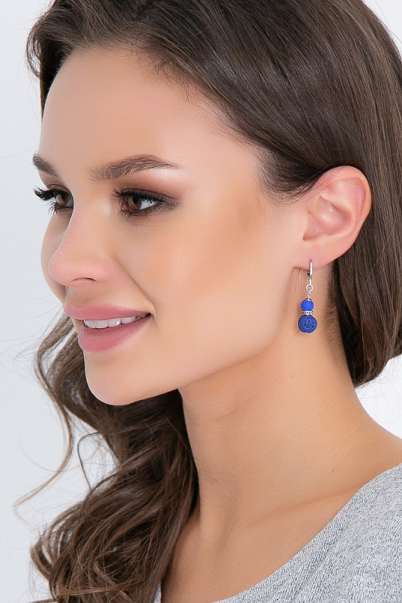 Страто - серьги с бусинами вулканической лавы синего цвета размером 10 и 6 мм. Швензы с английской застежкой родированные (гипоаллергенны, не темнеют). Длина сережки со швензой - 42 мм. Лава - символ знаний: помогает усваивать новую информацию, сосредоточиться на работе, справиться с волнением. Будьте уникальной вместе с "Белловера"!