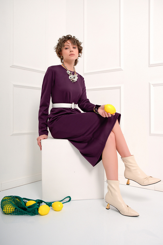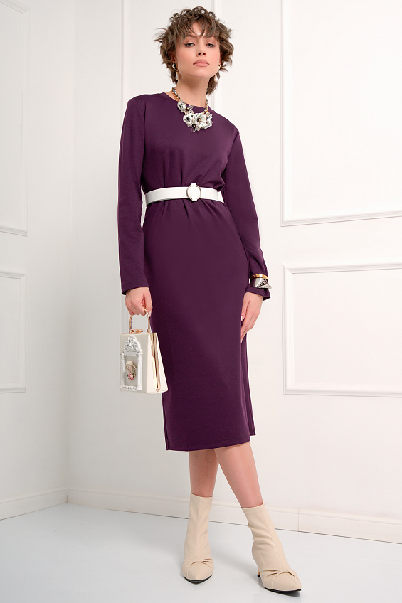 Треванно – платье полуприлегающего силуэта из однотонного трикотажа. Сливовый оттенок будет отлично смотреться на женщинах с любым оттенком кожи и придаст своей обладательницу еще больше изящества и утонченности. Платье отлично сочетается с различными украшениями, и великолепно подходит как для будней, так и для торжественных событий. Дополнить образ и подчеркнуть линию талии Вы можете с помощью интересного пояса или ремня (на модели использован ремень Мероне, в комплект не входит).